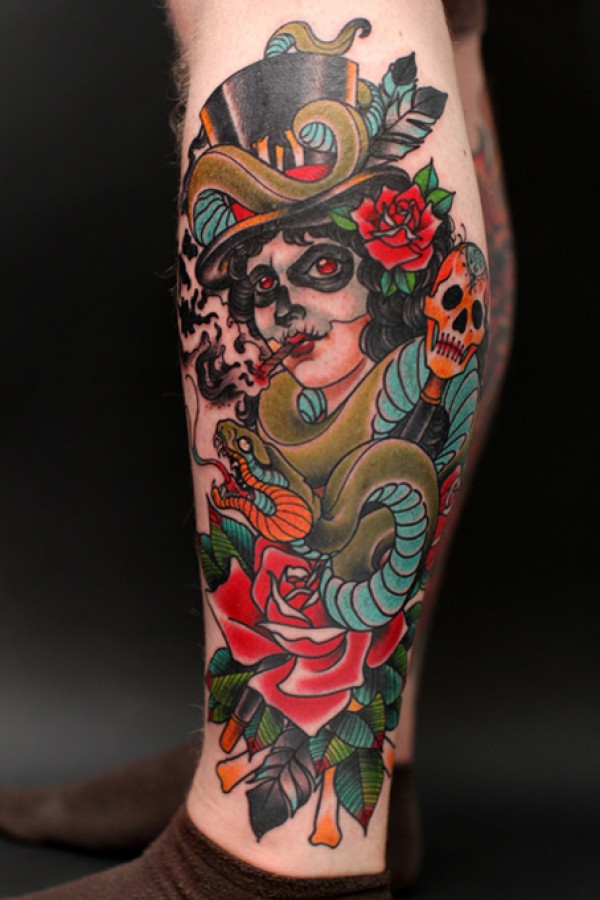 school风格纹身吸烟美女骷髅玫瑰纹身