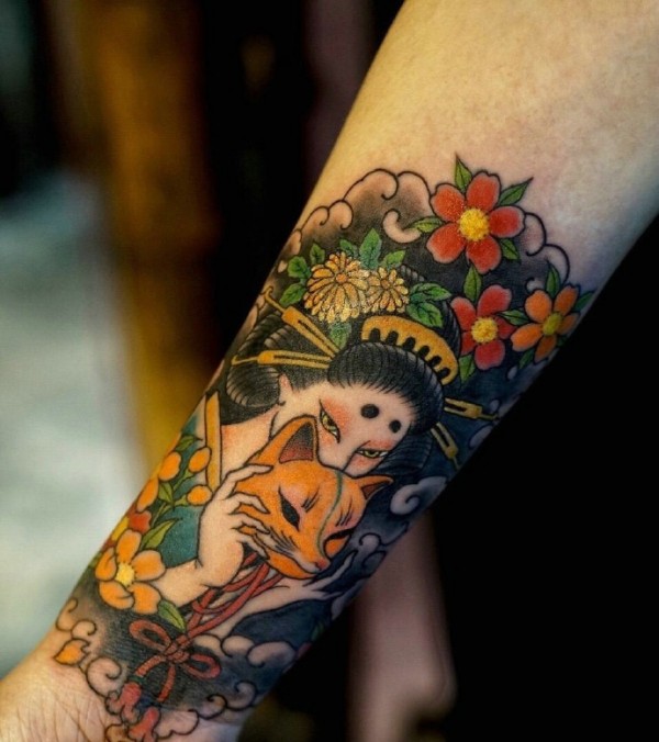 经典老传统手臂内侧彩色花旦纹身图片