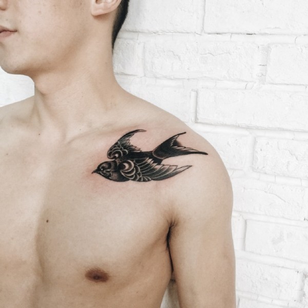 男人脖子彩色燕子刺青图案图片_脖子纹身图案大全_纹身图吧