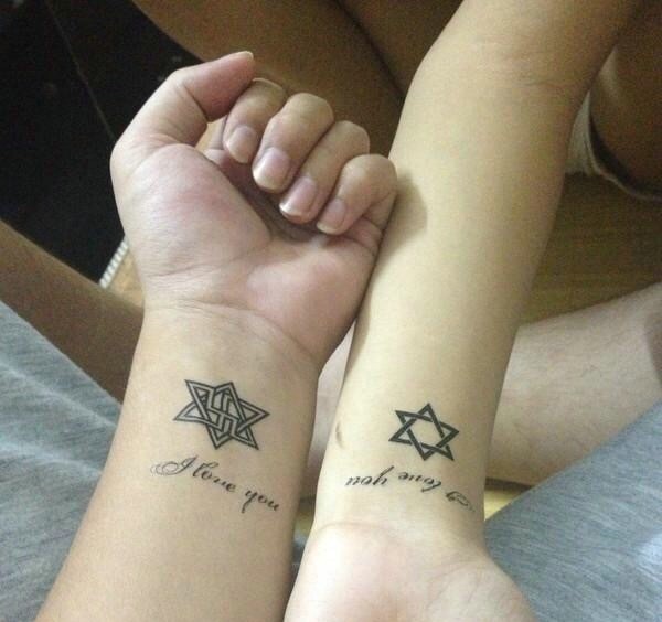 英文与六芒星结合的手臂情侣纹身图片