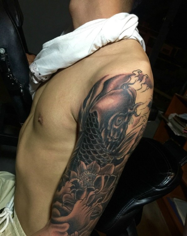 莲花与鲤鱼一起的大臂纹身图片