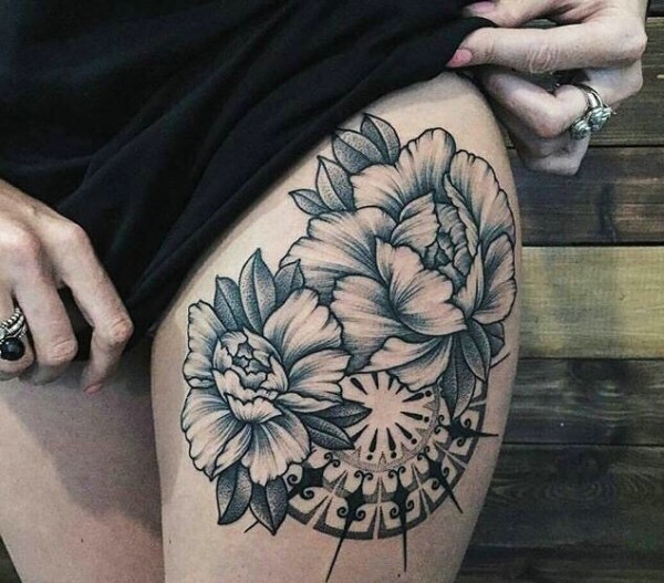 躲在女生大腿上的两朵花朵纹身图片
