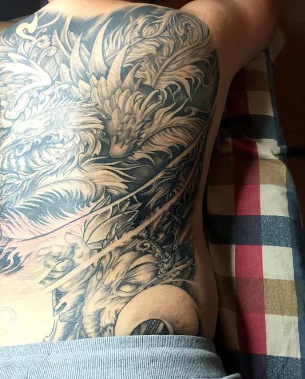 遮盖着整个后背的黑白大凤凰纹身图案
