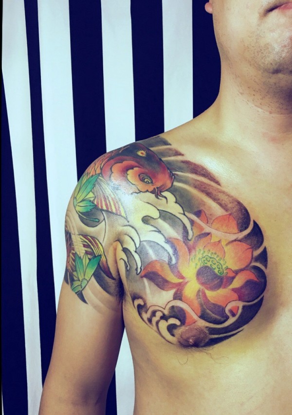 莲花与鲤鱼结合的彩色半甲纹身图案