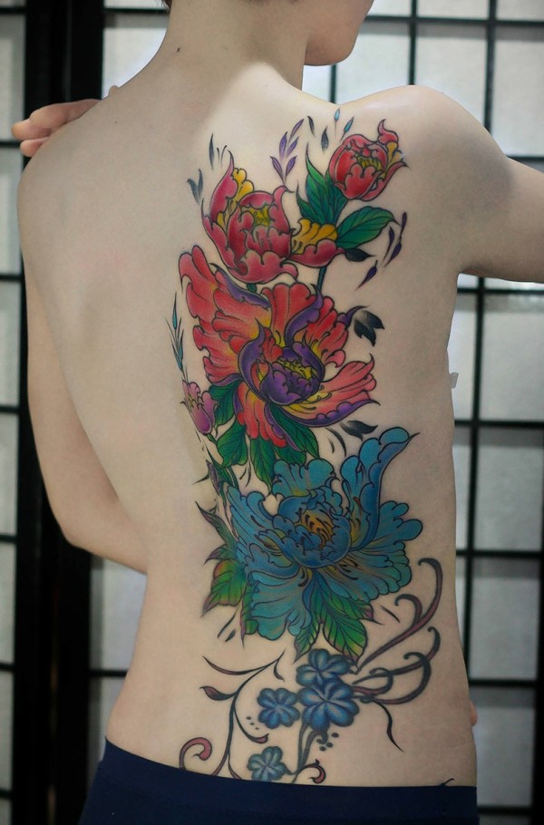遮盖女生半边背部的彩色牡丹花纹身刺青