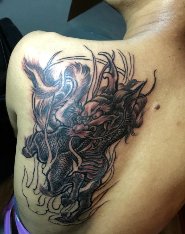 遮盖后背一部分的传统麒麟纹身刺青