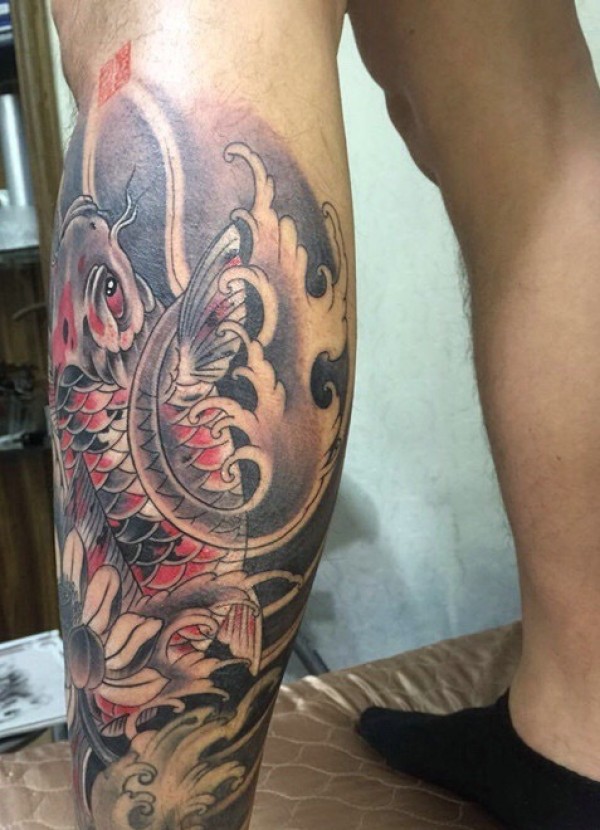 传统鲤鱼花小腿纹身_腿部纹身图案大全_纹身图吧