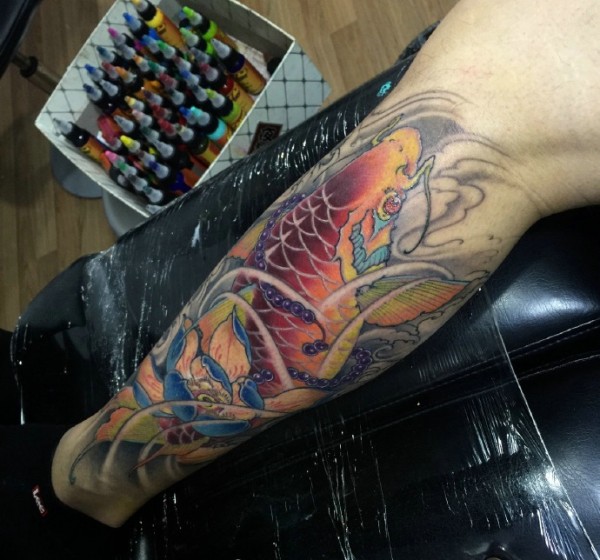 传统鲤鱼花小腿纹身_腿部纹身图案大全_纹身图吧