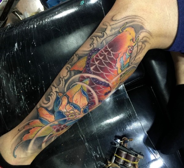包小腿莲花与红鲤鱼一起的纹身图片