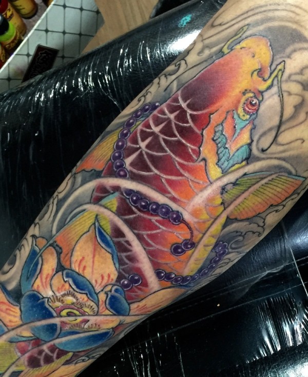 传统鲤鱼花小腿纹身_腿部纹身图案大全_纹身图吧