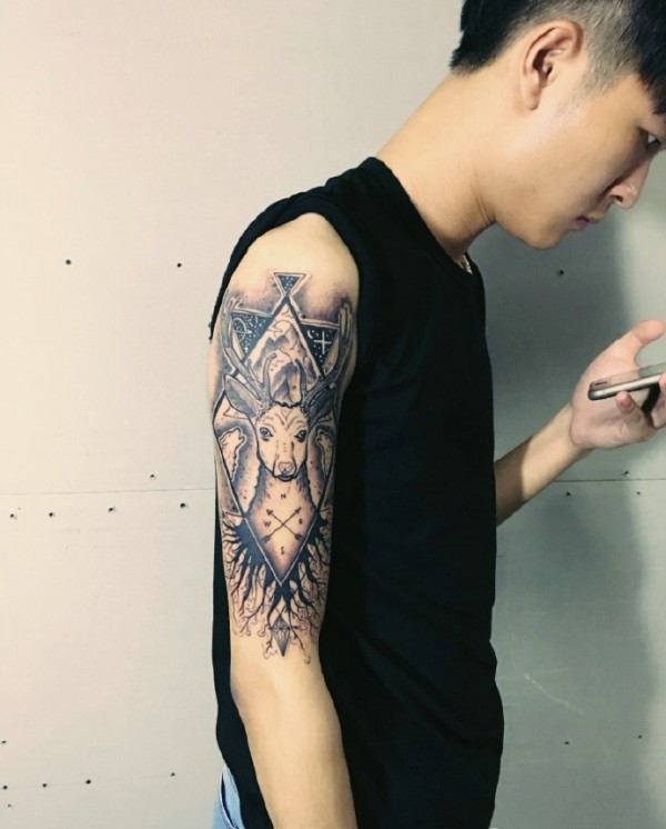 男士手臂几何鹿头纹身图片很帅气