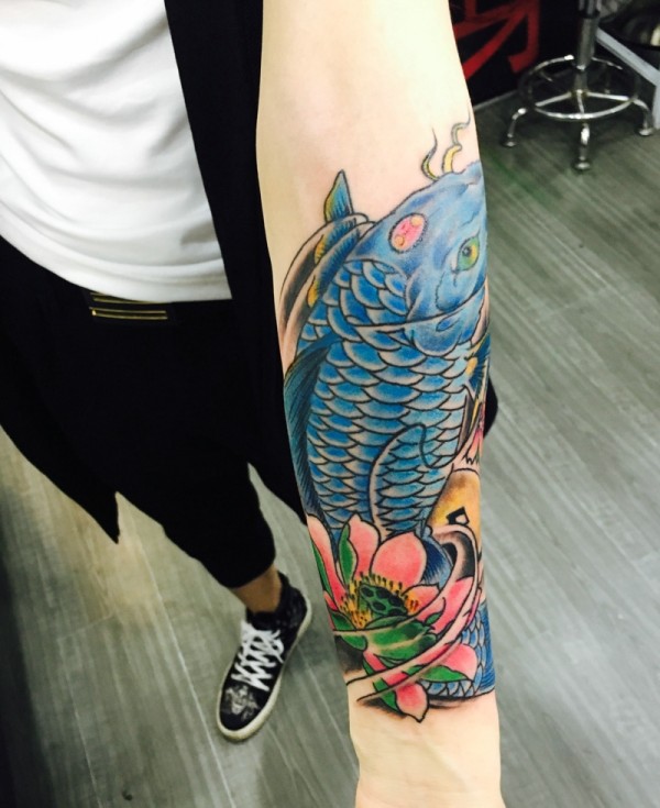 手臂蓝鲤鱼纹身图片魅力四射
