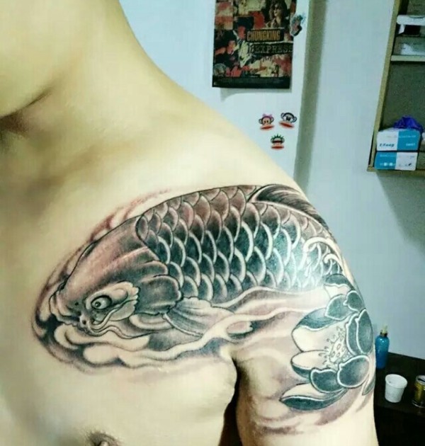 游过肩膀的黑白大鲤鱼纹身图片