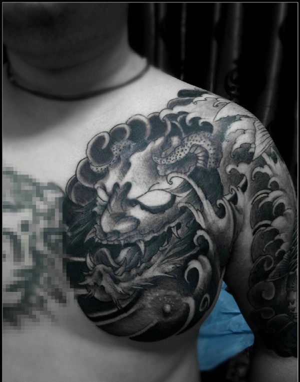 般若与鲤鱼结合的黑白半甲纹身图案