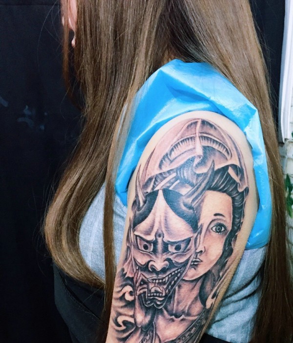 般若与女神肖像结合的大臂纹身刺青