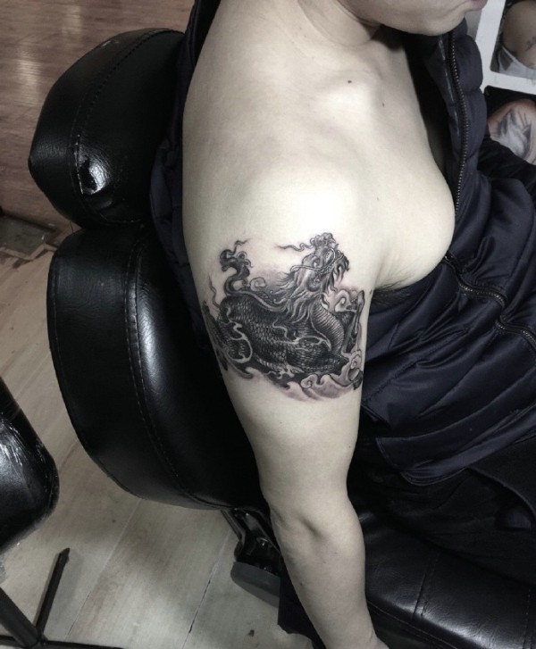 手臂老传统黑白小麒麟纹身刺青