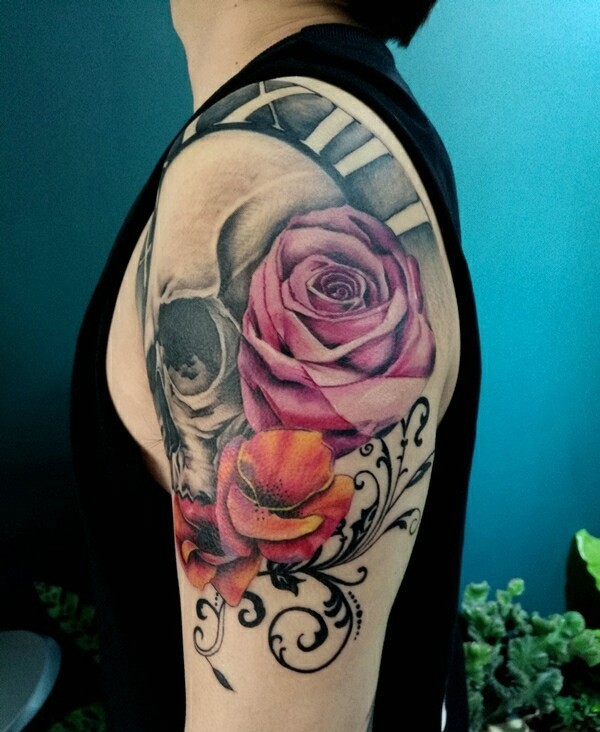 花朵与骷髅连着一起的手臂纹身刺青