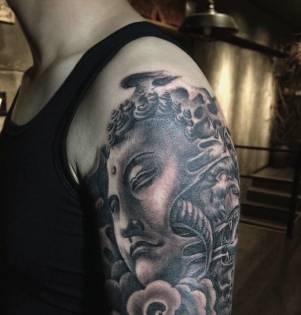 大臂经典传统黑白佛像纹身图案