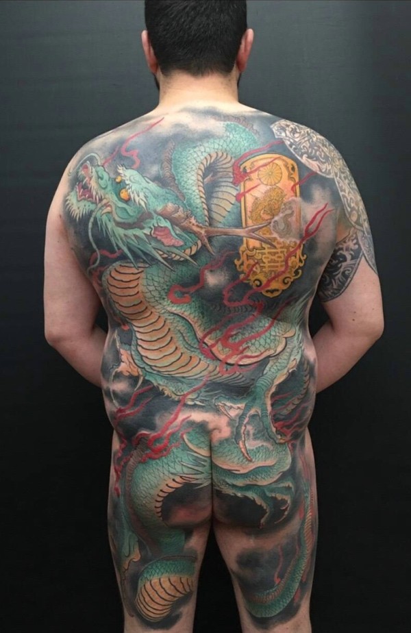 遮盖整个后背的彩色邪龙纹身图案