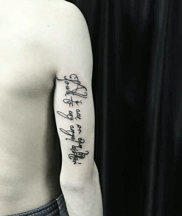 男生手臂外侧漂亮的英文纹身刺青