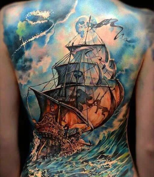 风雨无阻的满背炫丽海盗船纹身刺秦