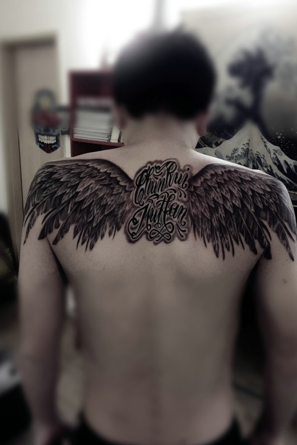 英文与翅膀结合的后背纹身刺青