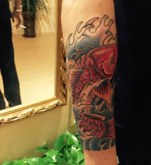 特别养眼的手臂红鲤鱼纹身图片