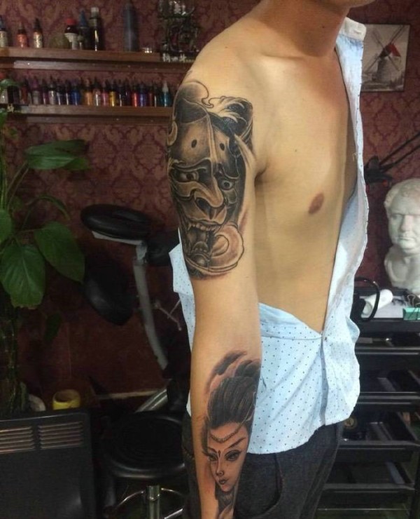 古代美女与般若一起的手臂纹身刺青