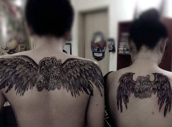 天使羽毛与英文结合的情侣纹身图案