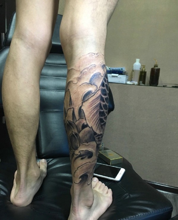 莲花与鲤鱼结合的腿部黑白纹身刺青