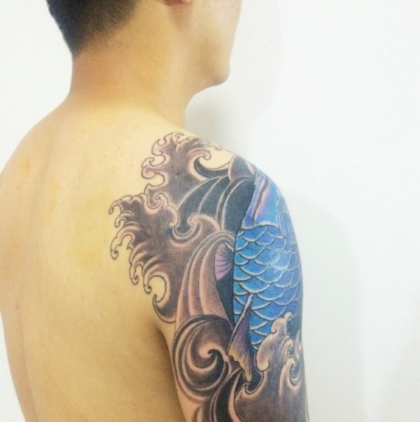 大臂上的抢眼蓝色鲤鱼纹身图片
