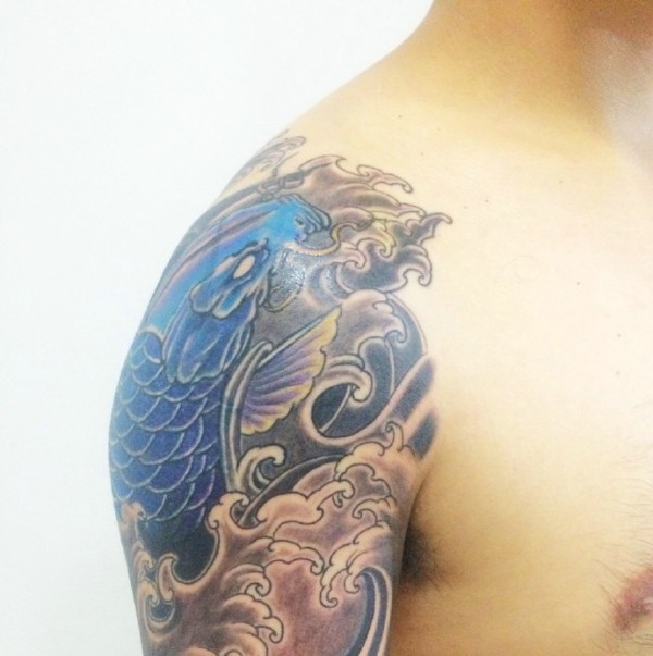大臂上的抢眼蓝色鲤鱼纹身图片