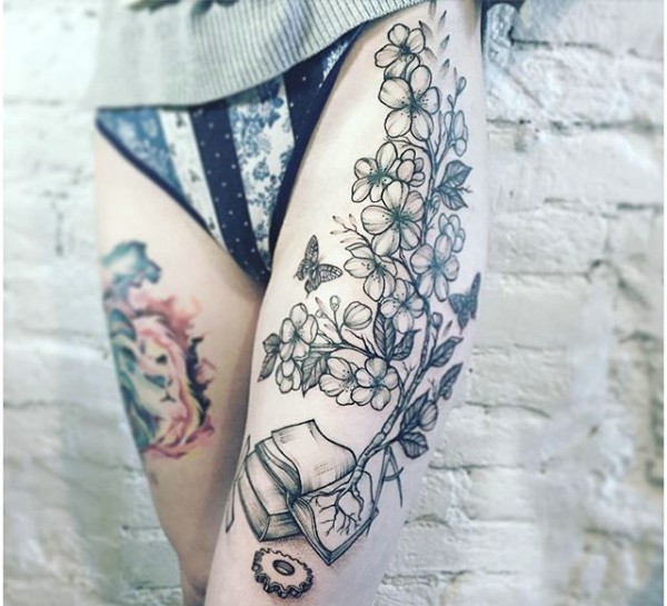 皙白大腿部黑灰花朵纹身刺青很性感