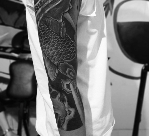 手臂黑黑一片的黑鲤鱼纹身刺青