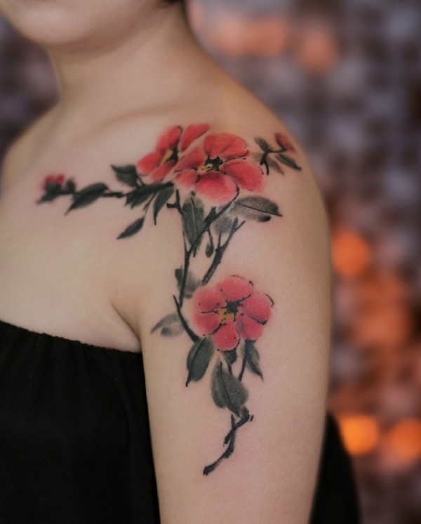 女生肩膀上的盛开梅花纹身刺青