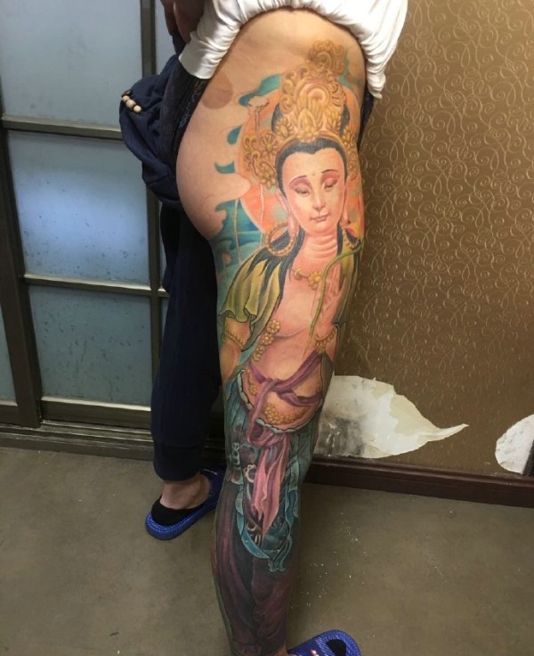 臀部到腿部的彩色女观音纹身刺青