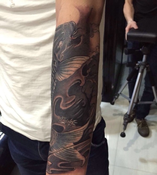 包手臂黑白鲤鱼纹身刺青自信满满