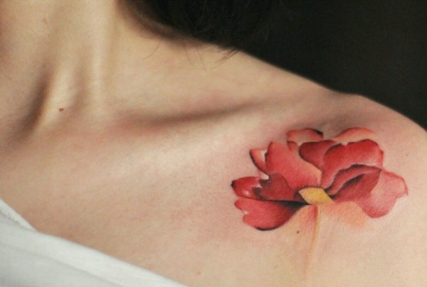 性感女神锁骨下一朵水彩花朵纹身刺青