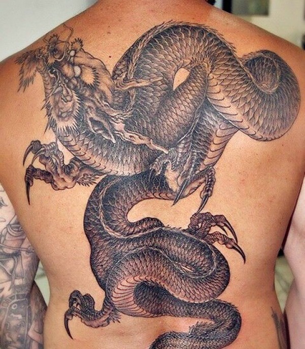 后背黑白传统大邪龙纹身刺青