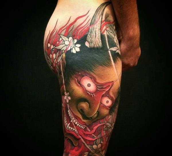 女生臀部惊人的彩色般若纹身刺青