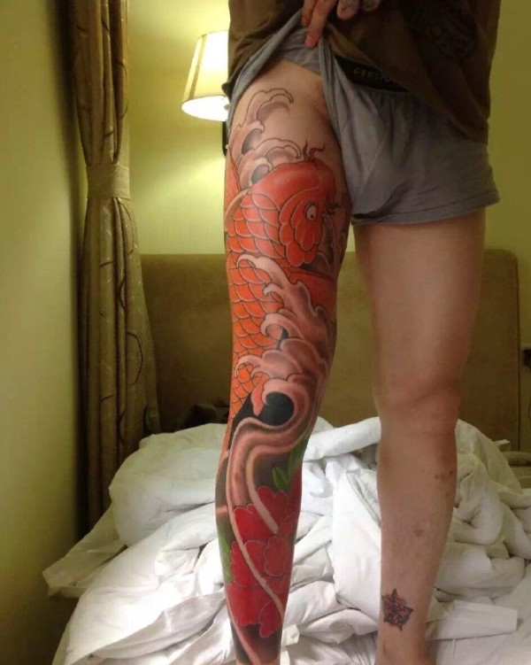 遮盖整个腿部的红色大鲤鱼纹身图案