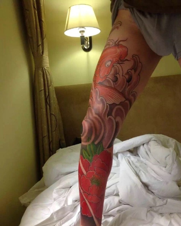 遮盖整个腿部的红色大鲤鱼纹身图案