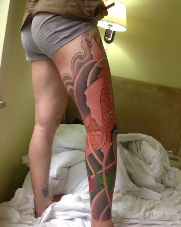 遮盖整个腿部的红色大鲤鱼纹身图案