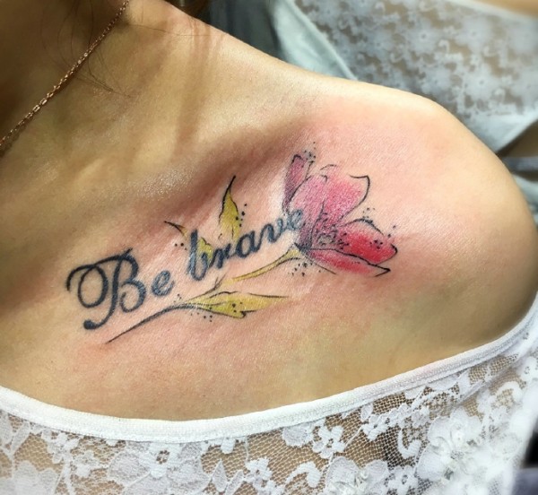 一枝花与英文字母的锁骨纹身刺青