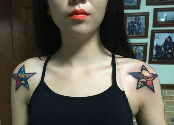 女生双肩膀彩色五角星纹身图案