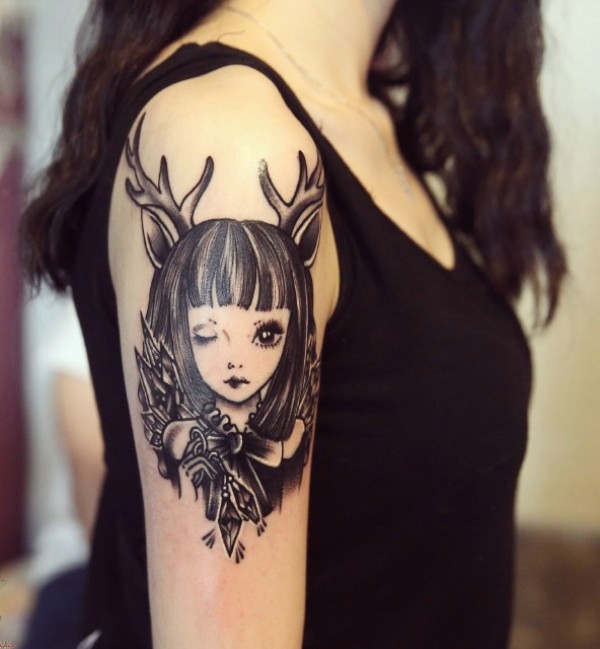 一枚鹿少女手臂纹身刺青很精致