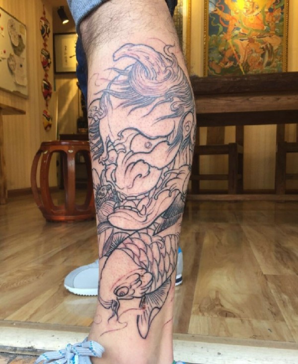 包小腿线条黑边般若纹身刺青