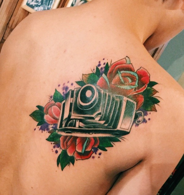 后背相机与花朵的纹身图案