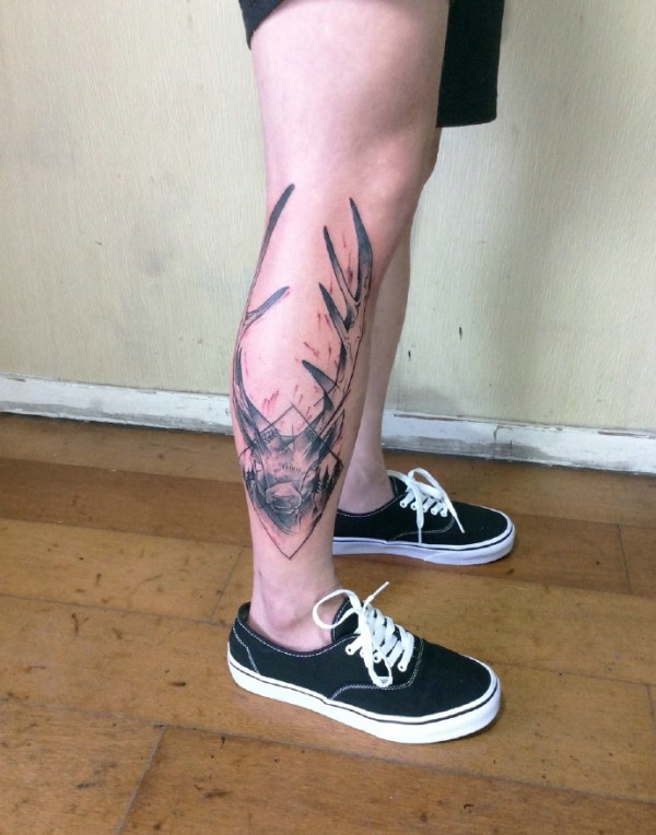 几何与鹿头结合的腿部纹身图案