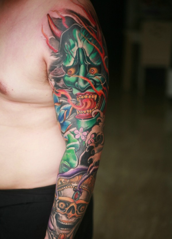 大臂精彩无限的彩色般若纹身图案